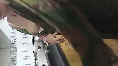 Indian wife in kitchen sucking husband